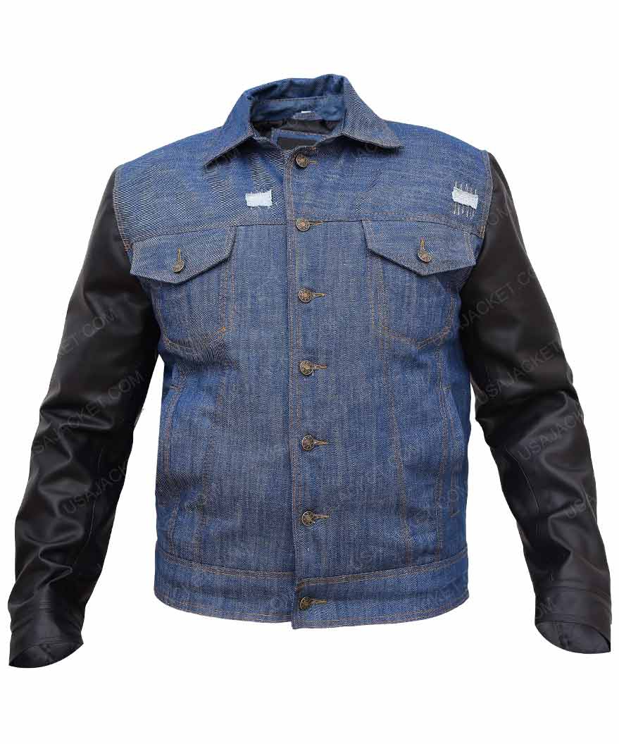 Denim & Faux Leather Viscose Lining Standard Collar Front Button Closure Blue and Black Color